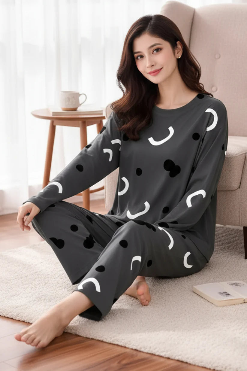 Grey Planet Music With Black Pajama Printed Night Suit loading